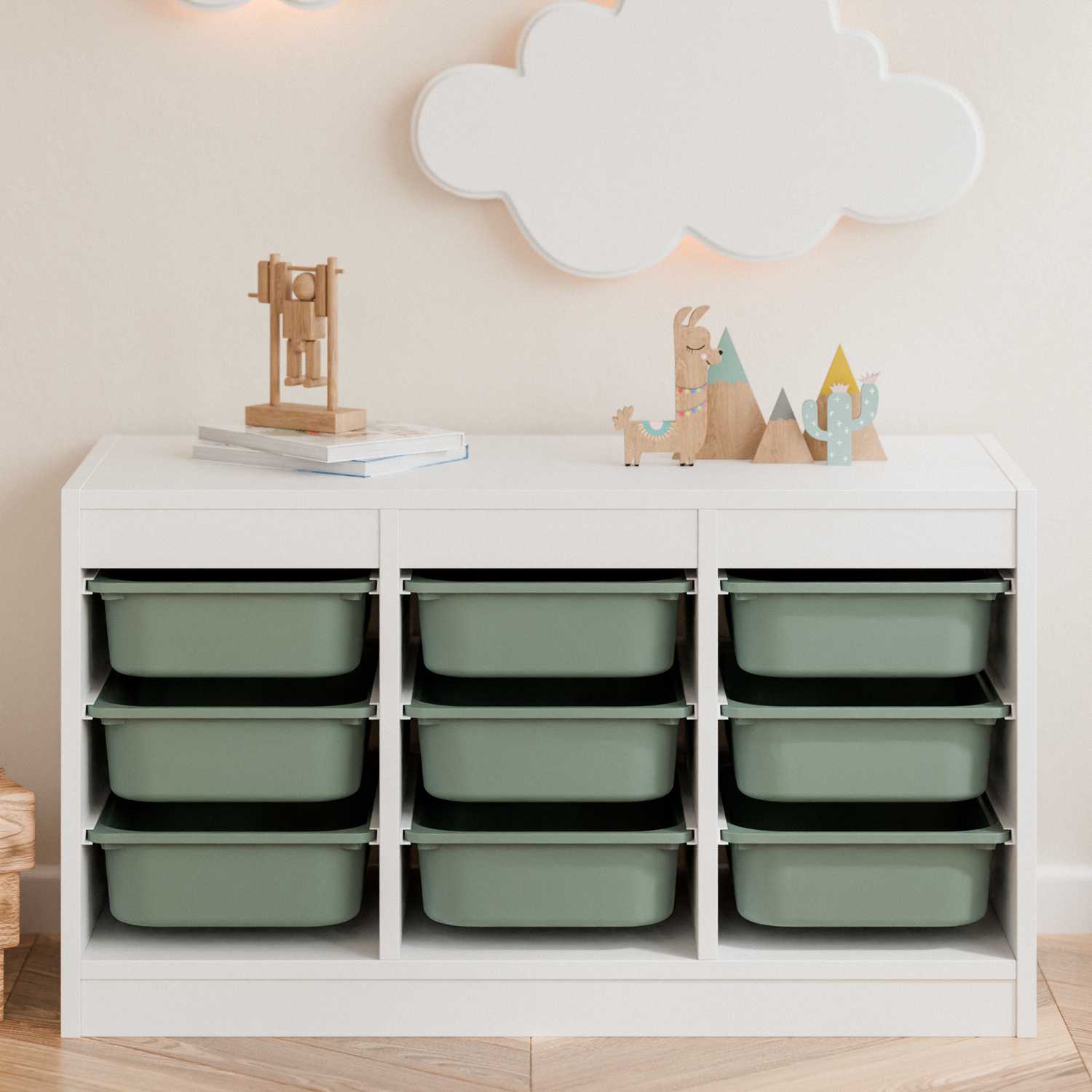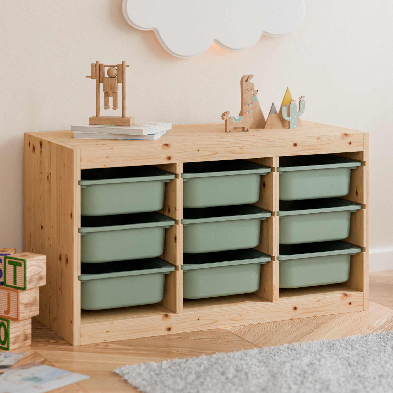 In Eukalyptus Grün setzen die Boxen natürliche Akzente in deinem Zuhause und bringen eine einladende Stimmung ins Kinderzimmer. Sie können sowohl quer als auch längs in die unterschiedlichen Trofast Regale eingeschoben werden.