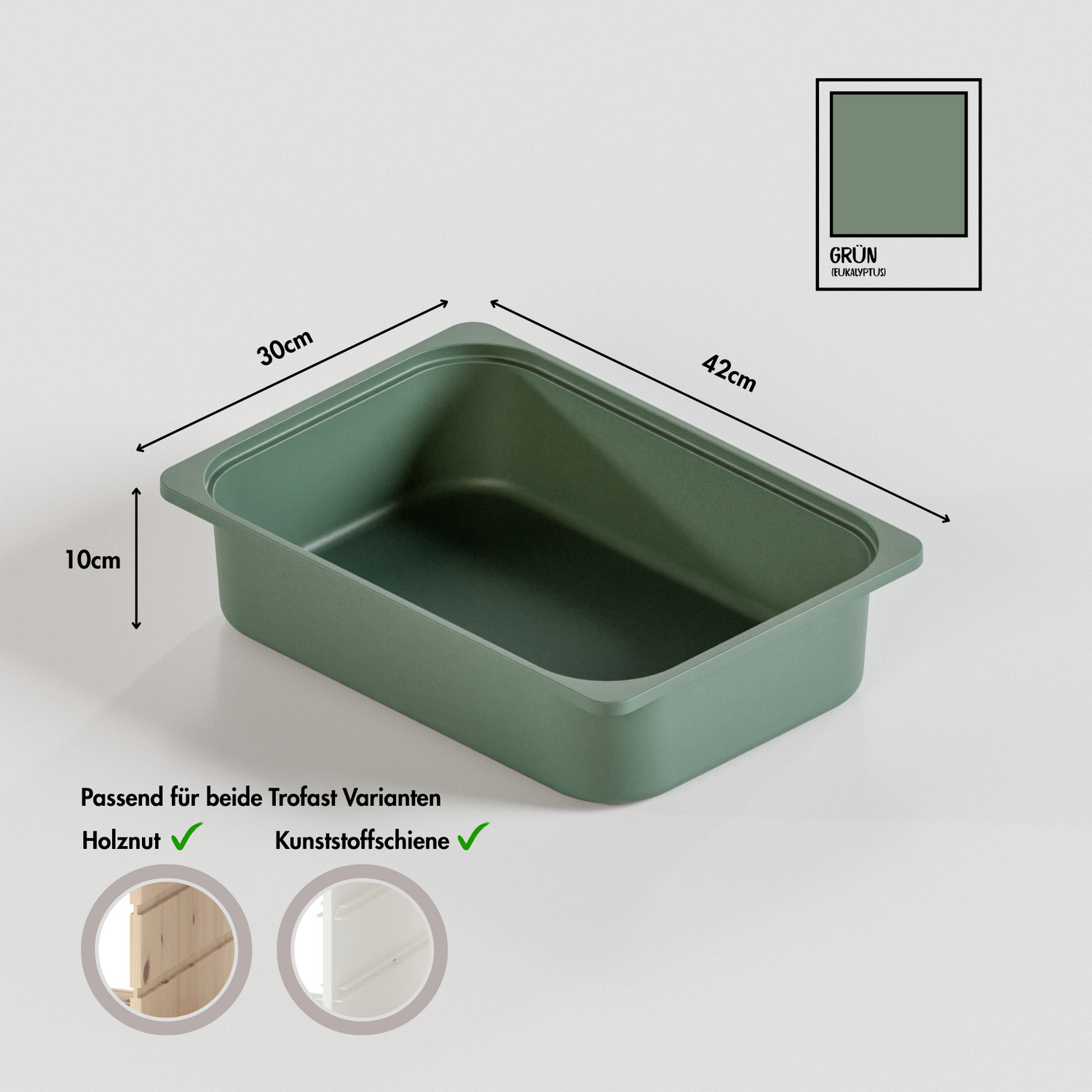 Mit der TRÖVI Aufbewahrungsbox bringst du schnell Ordnung in dein Zuhause. Die Außenmaße von 42 x 30 x 10cm sind präzise auf die IKEA Trofast Regale abgestimmt, sodass die Box sanft in die vorgesehenen Schienen oder Nuten gleitet. Im Kinderzimmer sortierst du Spielzeug und Kuscheltiere, im Bastelbereich verstaust du Stifte, Papier und Kleinteile, und im Haushalt bleibt alles übersichtlich an seinem Platz.
