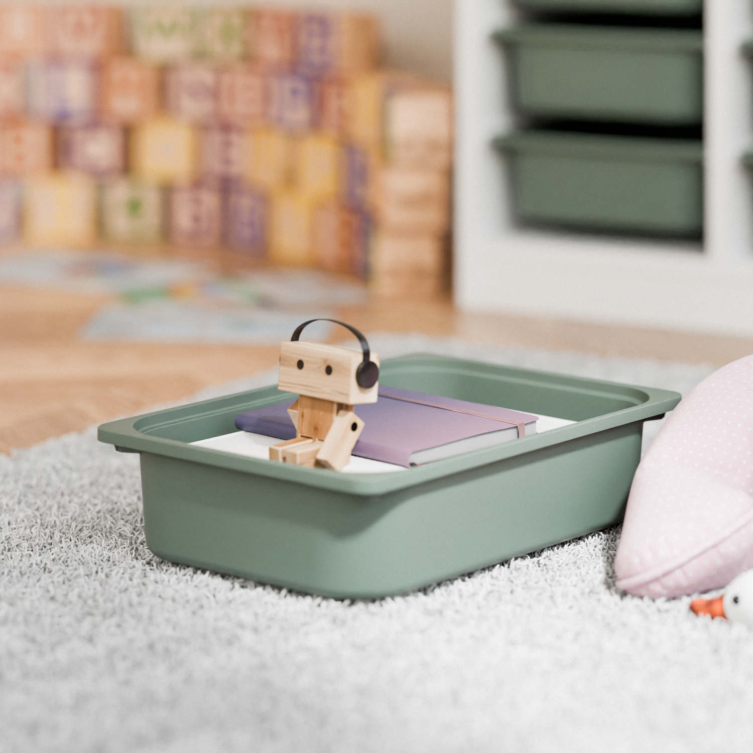 Der stoßfeste PP-Kunststoff fühlt sich stabil an, bleibt dabei angenehm leicht und lässt sich im Alltag mühelos sauber halten. Kinder können die Box eigenständig herausziehen und wieder einsortieren, was selbstständiges Handeln im Sinne der Montessori Pädagogik unterstützt. Außerhalb des Regals lassen sich mehrere Boxen ineinander stapeln, sodass du bei Nichtgebrauch wertvollen Platz sparst.