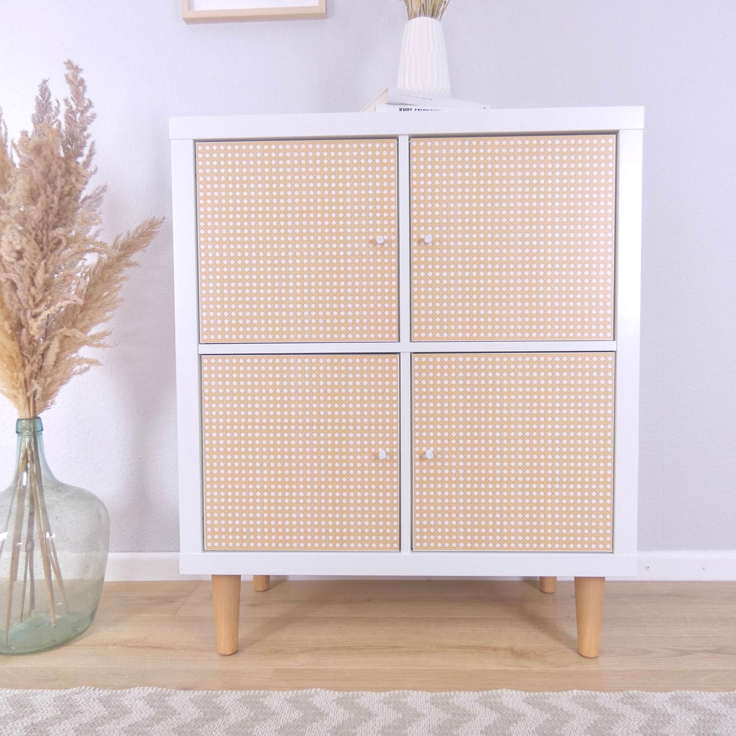 Die tollen DIYs, bei denen Ikea Möbel mit Wiener Geflecht verschönert werden, sind derzeit sehr beliebt. Leider ist das Material sehr teuer und die Umsetzung mit viel Arbeit verbunden. Eine simple Alternative bieten wir mit unseren Möbelfolien in Rattanoptik. Diese sind perfekt auf die Kallax Türen zugeschnitten und erzeugen durch das extrem realistische Design den gleichen Effekt wie das bekannte Wiener Geflecht.