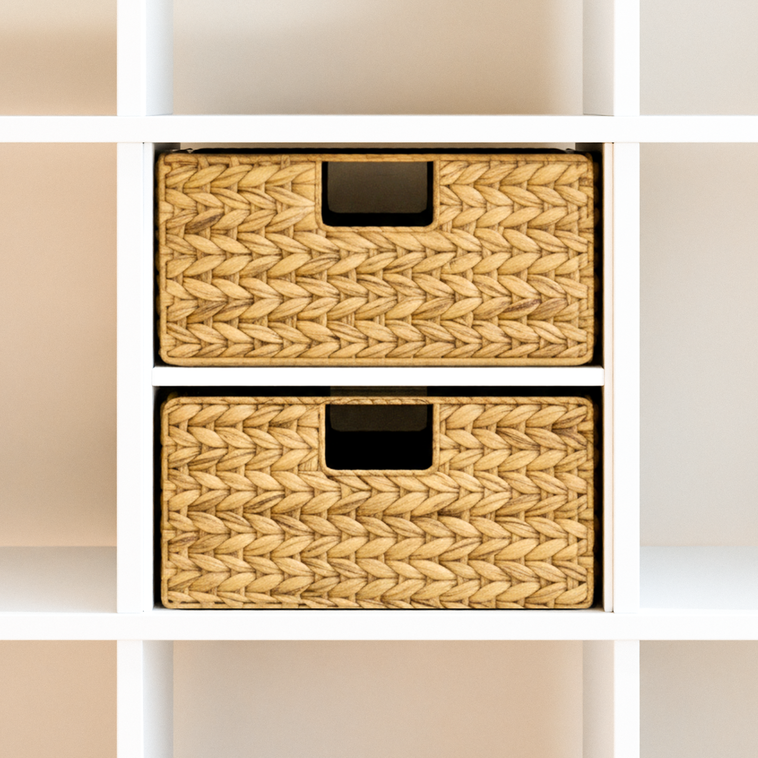 Du liebst dein Kallax Regal, suchst aber nach einer praktischen und stilvollen Lösung für die Fächer mit Zwischenboden? Dann ist dieses 2er-Set Körbe aus Wasserhyazinthe genau das Richtige für dich! Ihre halbhohe Form ist perfekt abgestimmt, um den Platz optimal zu nutzen und eine aufgeräumte Optik zu schaffen. So verwandelst du dein Regal in ein echtes Organisationstalent.