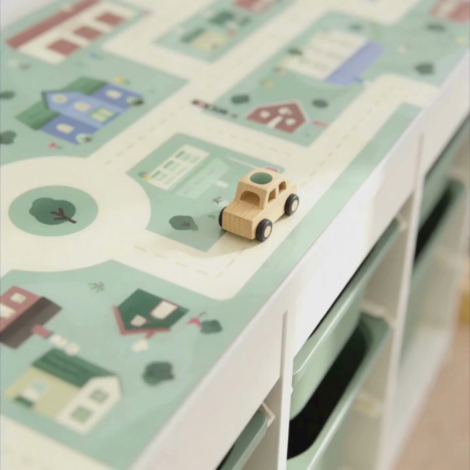 Verwandle dein IKEA TROFAST Regal in eine lebendige Spielwelt! Auf dieser detailreichen Spielmatte gibt es an jeder Ecke etwas Neues zu entdecken: Ob der Einsatzwagen zur Feuerwehr eilt oder die Spielfiguren den Weg zur Schule suchen – die liebevollen Illustrationen regen die Fantasie deines Kindes sofort an. Die Spielstraße bietet den idealen Untergrund für alle gängigen Spielzeugautos und Tiere, sodass dein Kind direkt in sein nächstes Abenteuer eintauchen kann.